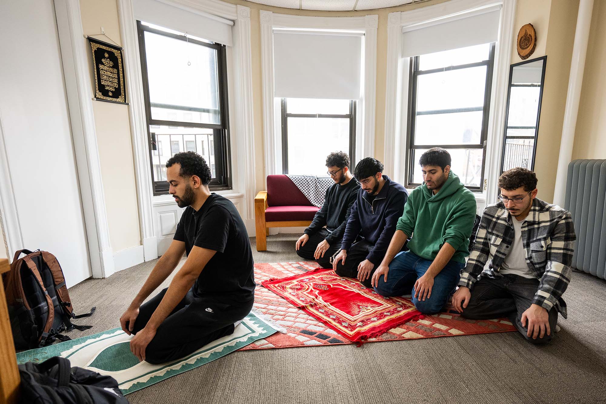 In the KHC lounge-turned–Muslim Prayer Room, Rayan Djelmami-Hani (CAS’26) leads the Maghreb prayer after breaking the day’s fast prior to iftar. “In Islam, leading the prayer isn’t about status,” Djelmami-Hani says. “Rather, it’s about serving your community in that moment and helping everyone come together to worship God. It’s also a reminder to lead with care and humility. Especially during Ramadan, which is such a spiritual and reflective time, it feels really meaningful to be part of something that connects us all, even when we’re far from our families.”