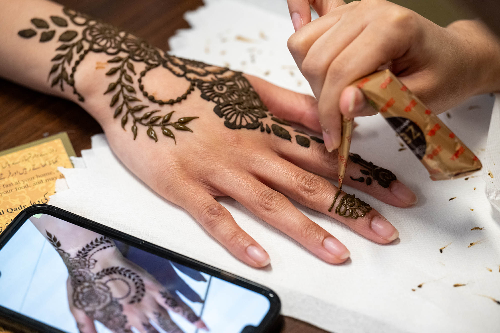 Raheeq Ibrahim (CAS’25) (from left), Raida Utomo (CAS’26), and a student who declined to give her name, talk in the sisters’ lounge in the GSU. Ibrahim was impressed by Utomo’s skill at studying for an exam with one hand on her laptop while getting some henna applied to the other. “Anything to look good for Eid!,” said Utomo, who was catching a flight shortly after her exam to observe Eid with her family in Kentucky.