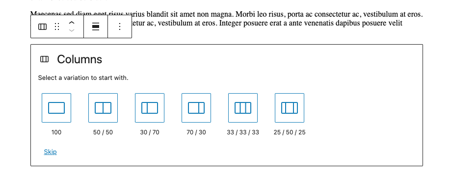 Block Variations can also be shown in a picker during the initial setup of a block similar to how the core Columns block does to show different column layouts to choose from.