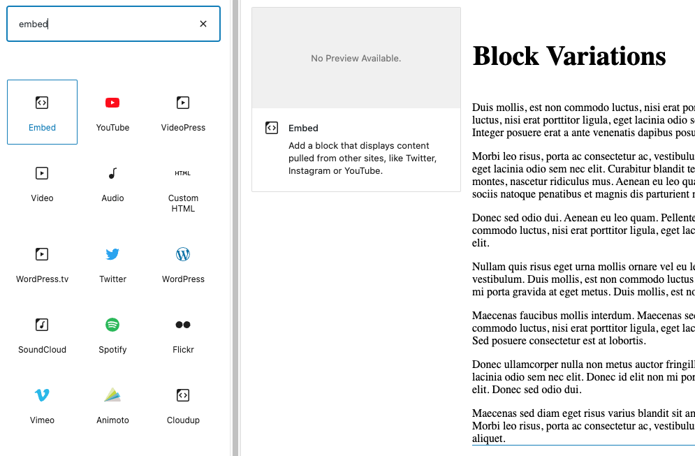 The Block Variations API allows for developers to create a variation of an existing block. A Block Variation is in some ways a faux block that appears in the inserter as if it is a separate custom block. However the block inherits all of it’s markup and features from the original block. The Block Variation however let’s the developer set many of the settings of the block to a specific value so that when inserted into the post the variant block is already configured for a specific setup, structure, or content.