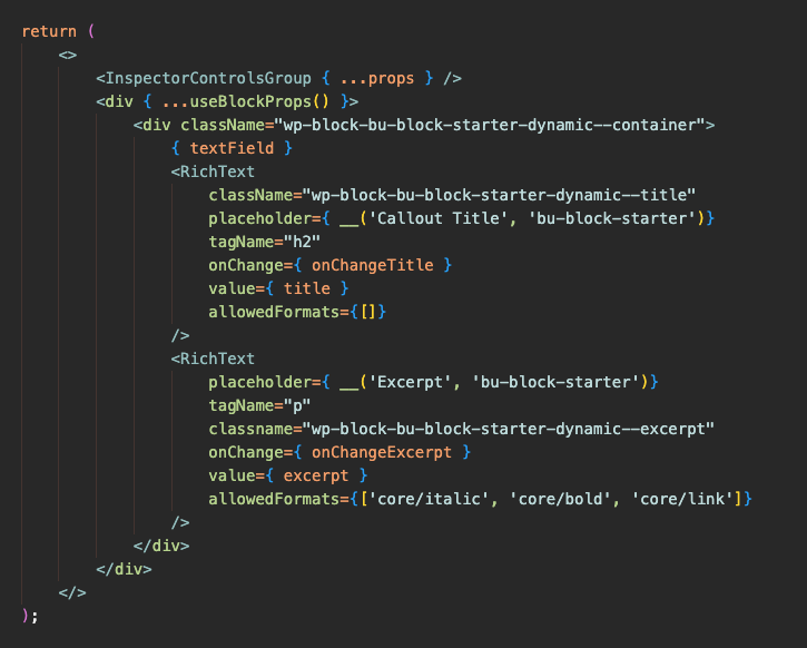 You’ll probably also have some attributes destructured and some functions for handling onChange events for those components so you can save the data when the user modifies components in the block.